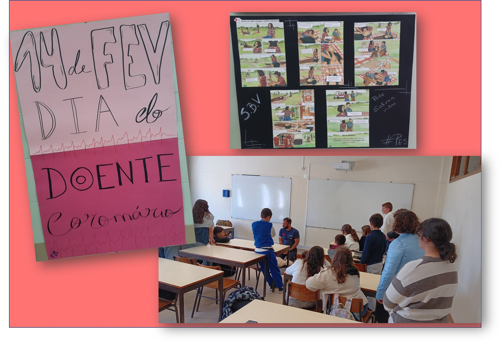 Nos dias 11 e 26 de março, o nosso Agrupamento de Escolas não se limitou a falar de saúde nos livros; passámos à ação! Para celebrar o Dia Nacional do Doente Coronário, recebemos a visita do Bombeiro Emanuel Seleiro dos Bombeiros Voluntários da Lourinhã para uma sessão prática e demonstrativa sobre Suporte Básico de Vida (SBV) destinada aos alunos do 6º ano – três turmas da Escola Básica de Ribamar e cinco turmas da Escola Básica Dr. João das Regras. Esta data recorda-nos a importância de cuidar do coração e, acima de tudo, de saber reagir quando algo corre mal. Na sessão, os alunos aprenderam que, perante uma emergência, o mais importante é manter a calma e ligar imediatamente para o 112. Mas o momento alto foi a demonstração das compressões torácicas, em que os alunos tiveram oportunidade de observar o bombeiro a praticar no manequim, percebendo assim força e a rapidez necessárias para manter um coração a “bater” até à chegada da ambulância. Os alunos aprenderam também a colocar uma pessoa na Posição Lateral de Segurança (PLS), uma técnica simples que pode salvar alguém de sufocar. Com esta iniciativa, a nossa escola reforça que a segurança e a solidariedade andam de mãos dadas. Não poderíamos terminar sem deixar um agradecimento muito especial ao bombeiro Emanuel Seleiro, pela sua paciência, clareza e dedicação ao ensinar aos nossos alunos gestos que salvam vidas. O nosso “Muito Obrigado”! Graças à sua presença, a nossa escola está hoje mais segura e cheia de novos “socorristas” prontos a ajudar o próximo.